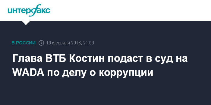 Москва. 13 февраля. INTERFAX.RU - Глава ВТБ Андрей Костин заявил о намерении подать в суд на Всемирную антидопинговую организацию (WADA) в связи с заявлениями о причастности банка к коррупционным схемам.
