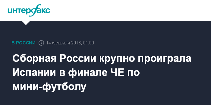 Москва. 14 февраля. INTERFAX.RU - Сборная России по футзалу стала вице-чемпионом Европы, уступив в финале испанской команде.