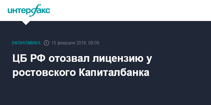 Москва. 15 февраля. INTERFAX.RU - Центральный банк РФ отозвал лицензию на осуществление банковских операций у Капиталбанка, зарегистрированного в Ростове-на-Дону, говорится в сообщении ЦБ.