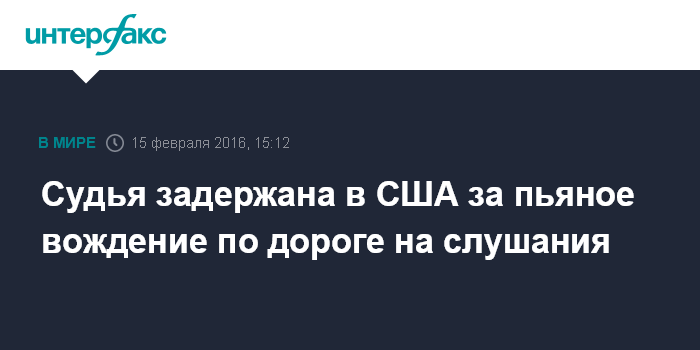 Москва. 15 февраля. INTERFAX.RU - Судья окружного суда в американском штате Нью-Йорк задержана по дороге на работу за вождение в состоянии алкогольного опьянения, сообщает в понедельник телеканал Fox News.