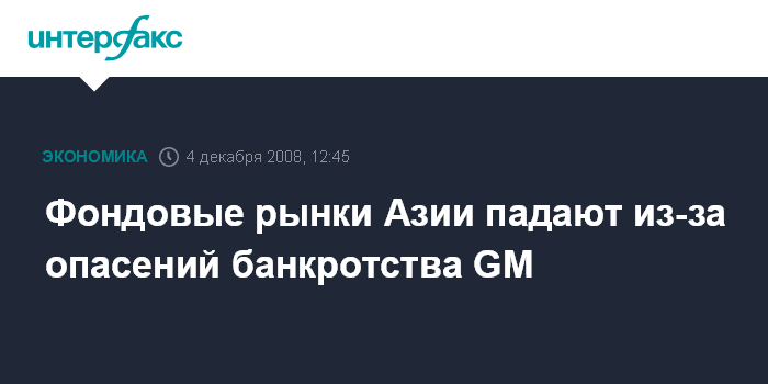 Москва. 4 декабря. INTERFAX.RU - Азиатские фондовые индексы упали в четверг на опасениях банкротства лидеров автопрома США - General Motors и Chrysler LLC, сообщило агентство Bloomberg.