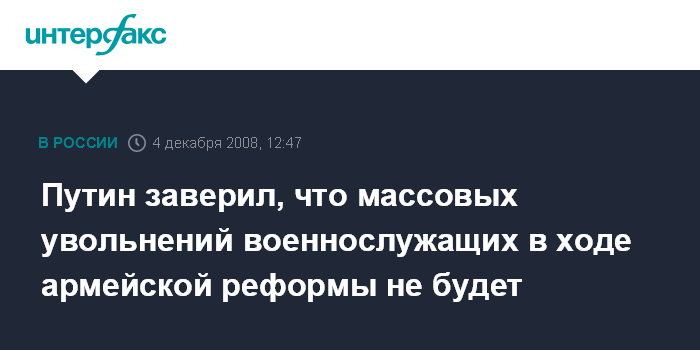 Москва. 4 декабря. INTERFAX.RU - Председатель правительства РФ Владимир Путин заявил, что массовых увольнений офицеров и прапорщиков в ходе перевода Вооруженных сил к новому облику не будет.
