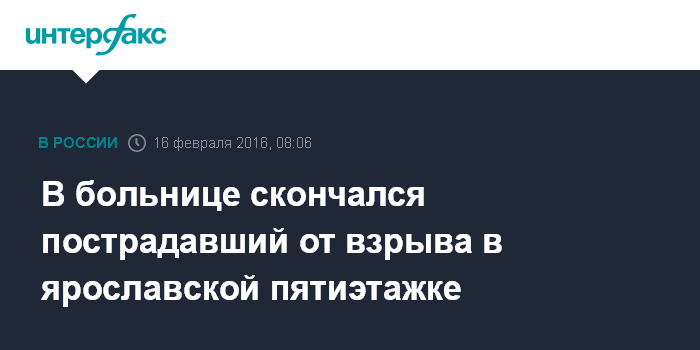Москва. 16 февраля. INTERFAX.RU - В результате взрыва газа в жилой пятиэтажке в Ярославле погибли два человека, сообщили "Интерфаксу" в Центральном региональном центре МЧС РФ.
