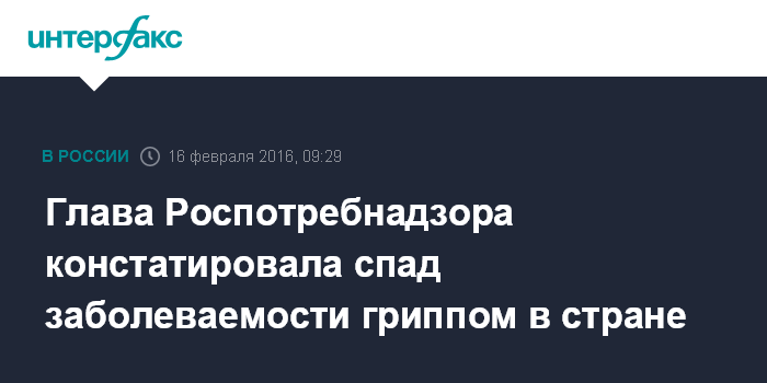 Москва. 16 февраля. INTERFAX.RU - Заболеваемость гриппом в России пошла на спад, заявила "Интерфаксу" во вторник руководитель Роспотребнадзора, главный государственный санитарный врач РФ Анна Попова.