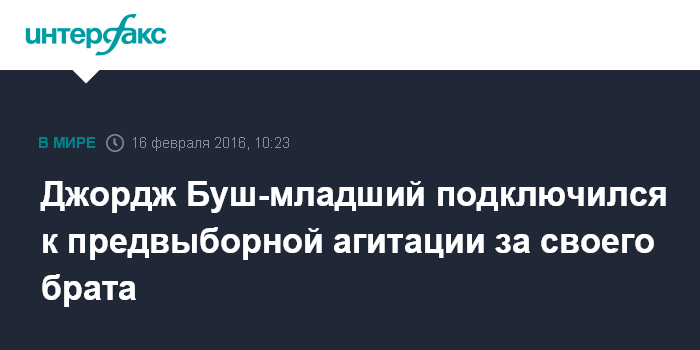 Москва. 16 февраля. INTERFAX.RU - Экс-президент США Джордж Буш-младший принял участие в предвыборной кампании своего брата Джеба Буша в рамках праймериз Республиканской партии, сообщает во вторник газета The Huffington Post.