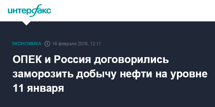 Москва. 16 февраля. INTERFAX.RU – Россия и ОПЕК по итогам переговоров в Дохе, состоявшихся утром во вторник, договорились заморозить добычу нефти на уровне 11 января, сообщает агентство Bloomberg со ссылкой на заявление министра нефти Катара Мухаммеда бин Салех аль-Сада.