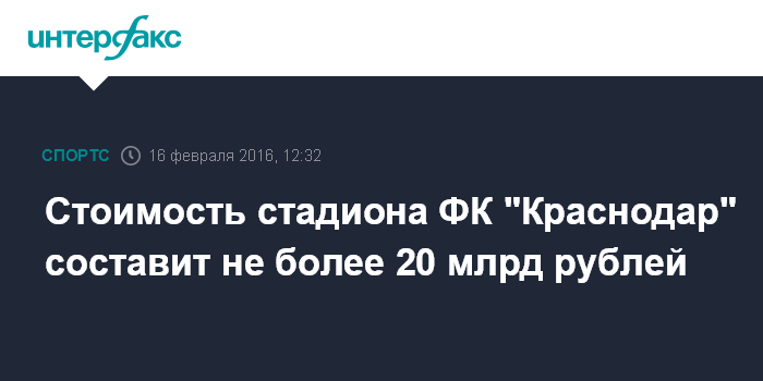 Москва. 16 февраля. INTERFAX.RU - Владелец футбольного клуба "Краснодар" Сергей Галицкий заявил о том, что стоимость строящегося стадиона для ФК будет находиться в пределах 20 млрд рублей.