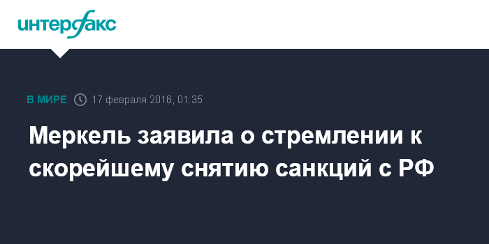 Москва. 17 февраля. INTERFAX.RU - Канцлер ФРГ Ангела Меркель заявила во время встречи с депутатами возглавляемой ею партии Христианско-демократический союз, что она желает как можно более быстрого снятия санкций с России, сообщают во вторник западные СМИ со ссылкой на представителей партии.