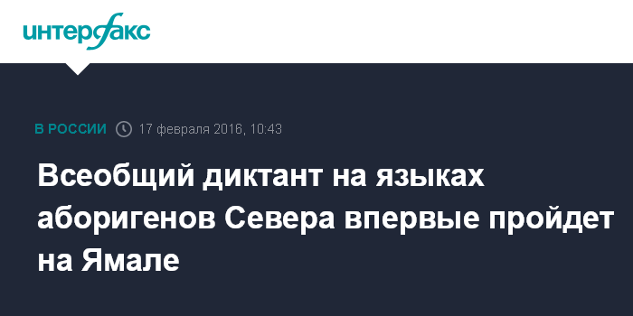 Москва. 17 февраля. INTERFAX.RU - Представители коренных малочисленных народов Севера смогут проверить свои знания родных языков, приняв участие во всеобщем диктанте, который пройдет 19 февраля в Салехарде, сообщает пресс-служба губернатора Ямало-Ненецкого автономного округа.