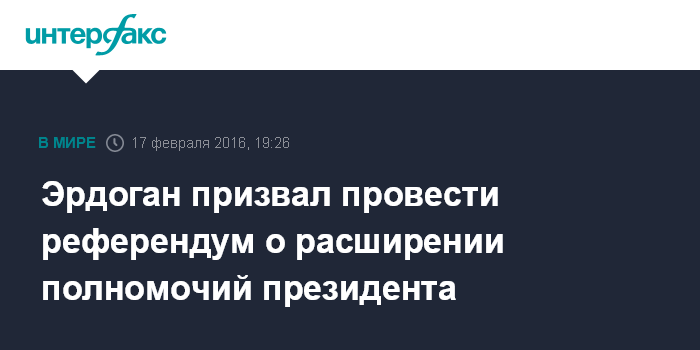 Москва. 17 февраля. INTERFAX.RU - Президент Турции Реджеп Тайип Эрдоган вновь заявил, что в стране необходимо провести референдум по изменению политической системы страны. Как сообщает Associated Press, Эрдоган призывает к расширению полномочий президента.