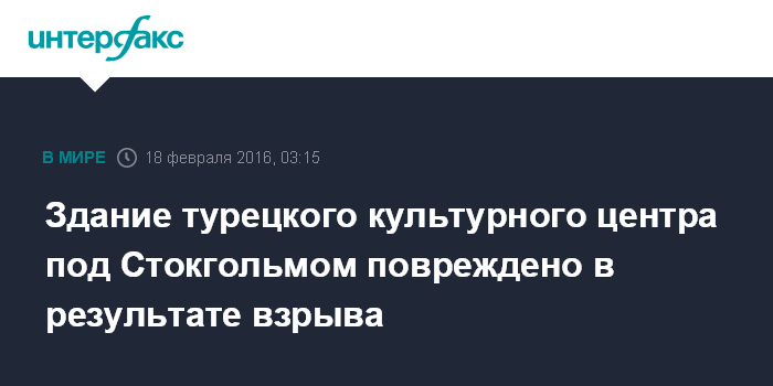 Москва. 18 февраля. INTERFAX.RU - В турецком культурном центре в пригороде Стокгольма в среду вечером произошел взрыв, сообщила газета Aftonbladet.