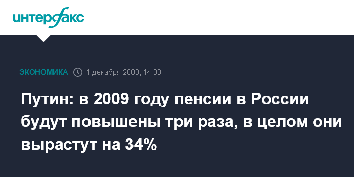 Москва. 4 декабря. INTERFAX.RU - В следующем году размер пенсионного обеспечения российских граждан будет повышаться трижды и в целом вырастет примерно на 34%, заявил премьер-министр РФ Владимир Путин.