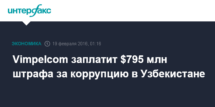 Москва. 19 февраля. INTERFAX.RU - Vimpelcom Ltd. заключил соглашения с Комиссией по ценным бумагам и биржам США (SEC), Минюстом США и прокуратурой Нидерландов (Openbaar Ministerie, OM) об урегулировании претензий в рамках расследования сделок компании в Узбекистане. По информации от представителей холдинга, Vimpelcom заплатит в общей сложности $795 млн в качестве штрафа и возврата доходов от незаконных сделок.