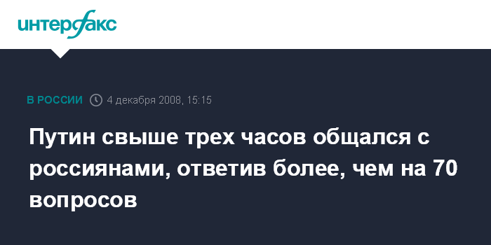 Москва. 4 декабря. INTERFAX.RU - Первое прямое общение с россиянами Владимира Путина в качестве премьер-министра и лидера партии "Единая Россия" продолжалось в четверг три часа 8 минут.