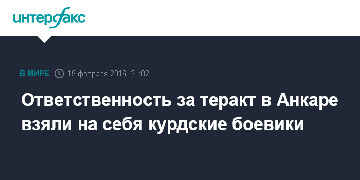 Москва. 19 февраля. INTERFAX.RU - Группировка курдских боевиков "Соколы свободы Курдистана" в пятницу взяла на себя ответственность за теракт, совершенный в среду в Анкаре, сообщает сайт ливанского издания Daily Star со ссылкой на заявление группы.