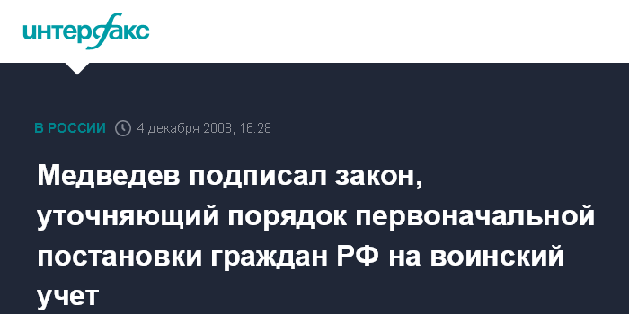 Медведев подписал закон, уточняющий порядок первоначальной постановки граждан РФ на воинский учет