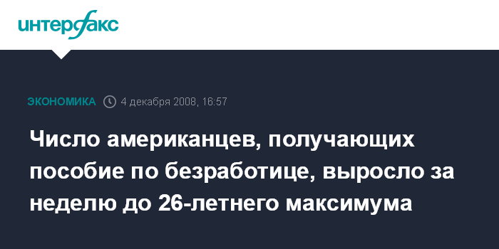 Москва. 4 декабря. INTERFAX.RU - Число американцев, получающих пособие по безработице, выросло за неделю с 17 по 23 ноября до 4,087 млн человек - максимального уровня за 26 лет, с 3,998 млн неделей ранее, сообщило агентство Bloomberg со ссылкой на данные министерства труда. Эксперты прогнозировали увеличение этого показателя до 4,03 млн.