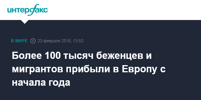 Москва. 23 февраля. INTERFAX.RU - Число беженцев и мигрантов, прибывших с начала 2016 года в Европу через Средиземное море, превысило отметку в 100 тыс. человек, сообщили во вторник в Международной организации по миграции (МОМ).