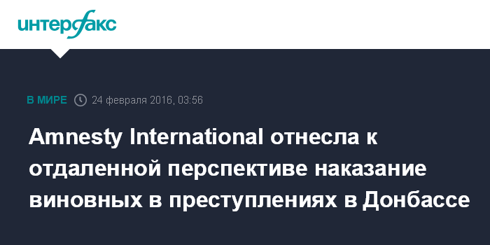 Москва. 24 февраля. INTERFAX.RU - Привлечение к ответственности виновных в преступлениях в Донбассе, несмотря на установление в регионе относительного затишья, остается отдаленной перспективой, заявляют в правозащитной организации Amnesty International (АI, "Международная амнистия").