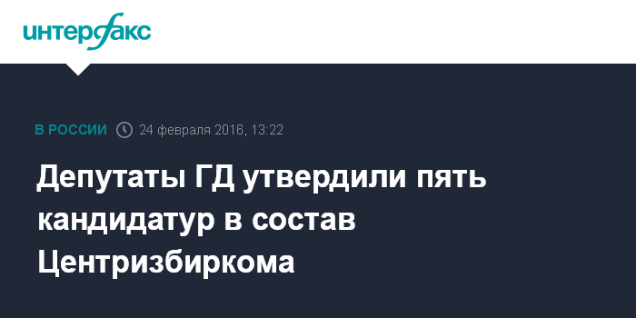 Москва. 24 февраля. INTERFAX.RU - Госдума на заседании в среду утвердила пять кандидатур в обновленный состав Центризбиркома (ЦИК РФ).