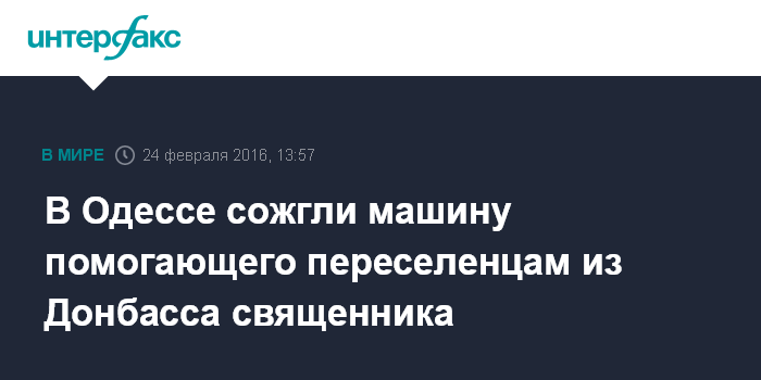 Москва. 24 февраля. INTERFAX.RU - Вечером 23 февраля неизвестные сожгли автомобиль руководителя социального отдела Одесской епархии Украинской православной церкви протоиерея Павла Полещука, который оказывает помощь переселенцам из Донбасса, сообщает епархиальная пресс-служба.
