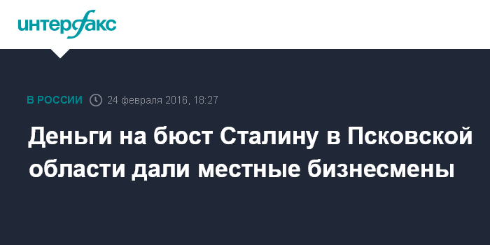 Москва. 24 февраля. INTERFAX.RU - Бюст Сталину, установленный в Псковской области, изготовлен на частные пожертвования местных предпринимателей, сообщили в среду "Интерфаксу" в Российском военно-историческом обществе (РВИО).