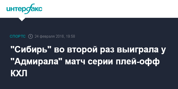 Москва. 24 февраля. INTERFAX.RU - "Сибирь" в Новосибирске обыграла "Адмирал" из Владивостока со счетом 4:0 (1:0, 2:0, 1:0) во втором матче 1/8 финала Кубка Гагарина.
