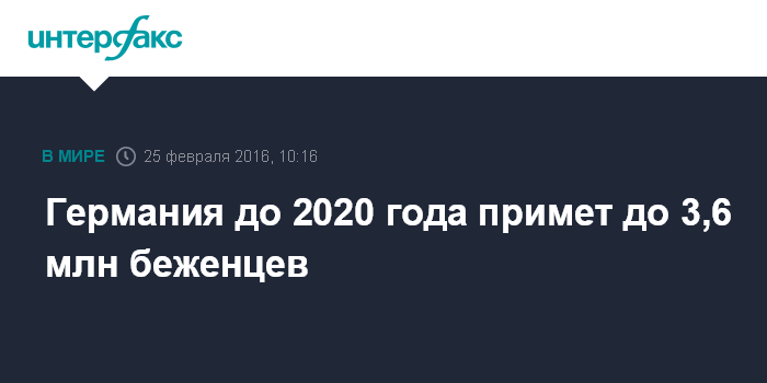 Москва. 25 февраля. INTERFAX.RU - Правительство Германии ожидает приема 3,6 млн беженцев до 2020 года - это означает, что в страну ежегодно будет прибывать примерно по 500 тысяч человек, сообщает в четверг немецкая пресса.