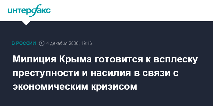 Москва. 4 декабря. INTERFAX.RU - В связи с экономическим кризисом милиция прогнозирует рост в Крыму числа разбоев, грабежей, хищений автотранспорта, распространение наркомании, причем в первую очередь кризисные процессы затронут молодежь.