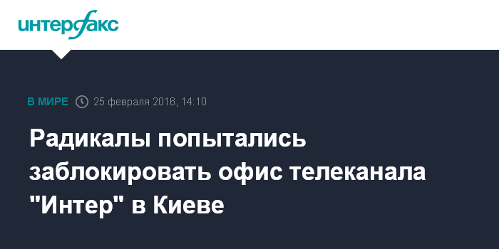 Москва. 25 февраля. INTERFAX.RU - Представители радикальной организации "Азов" в четверг попытались заблокировать здание в Киеве, в котором находится офис телеканала "Интер".