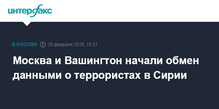 Москва. 25 февраля. INTERFAX.RU - Между РФ и США идет обмен данными о террористах в Сирии, заявила в четверг официальный представитель МИД России Мария Захарова.