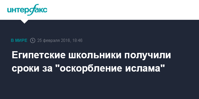 Москва. 25 февраля. INTERFAX.RU - Суд на юге Египта приговорил трех учеников школы к пяти годам заключения каждого за "оскорбление ислама", сообщает в четверг Русская служба "Би-Би-Си".