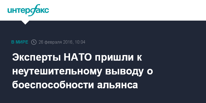 Москва. 26 февраля. INTERFAX.RU - Авторитетные эксперты в сфере обороны и безопасности подготовили для НАТО доклад, в котором раскритиковали боеспособность альянса на случай угрозы со стороны России в Восточной Европе, сообщает Financial Times.