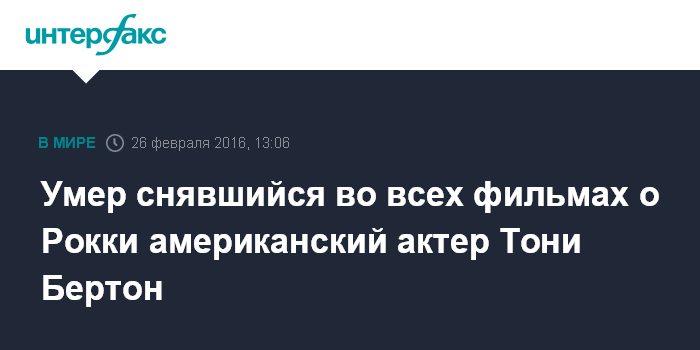 Москва. 26 февраля. INTERFAX.RU - Актер Тони Бертон, сыгравший во всех фильмах о боксере Рокки, скончался в возрасте 78 лет, сообщили местные СМИ.