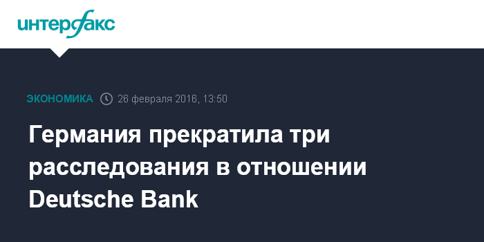Москва. 26 февраля. INTERFAX.RU – Федеральное управление по надзору за финансовым сектором (BaFin) Германии прекратило три расследования в отношении крупнейшего банка страны Deutsche Bank, также сняв претензии к бывшим топ-менеджерам банка, пишет Financial Times.