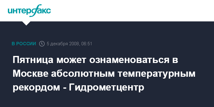 "Как ожидается, пятница будет очень теплым днем. Возможно, будет побит рекорд декабря в целом", - сообщил "Интерфаксу" замдиректора Гидрометцентра Геннадий Елисеев.