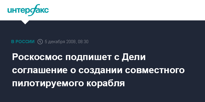 Москва. 5 декабря. INTERFAX.RU - Роскосмос подпишет в пятницу в Дели соглашение, предусматривающее участие России в пилотируемой программе Индии.