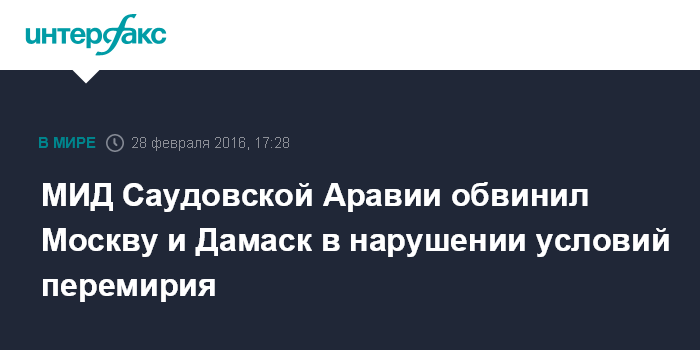 Москва. 28 февраля. INTERFAX.RU - Россия и сирийские власти нарушают условия прекращения огня в Сирии, заявил министр иностранных дел Саудовской Аравии Адель аль-Джубейр.