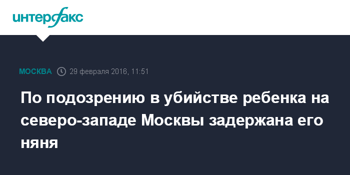 "В районе метро "Октябрьское поле" по подозрению в убийстве ребенка задержана его няня", - сказала Иванова.
