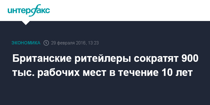 Москва. 29 февраля. INTERFAX.RU – Британские компании сферы розничной торговли сократят порядка 900 тыс. рабочих мест в течение следующего десятилетия, говорится в обзоре Британского консорциума ритейлеров (British Retail Consortium, BRC).
