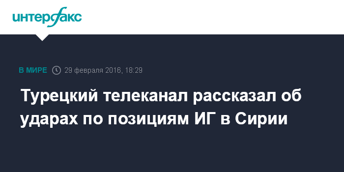 Москва. 29 февраля. INTERFAX.RU - Турецкая артиллерия в понедельник нанесла удары по позициям "Исламского государства" (террористическая организация, запрещенная в России - ИФ) на территории Сирии, сообщает турецкий телеканал NTV.