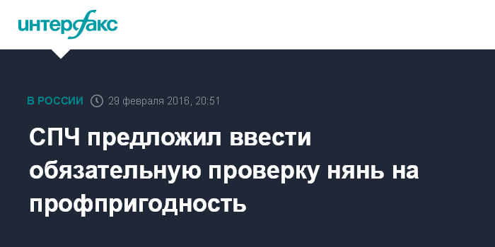Москва. 29 февраля. INTERFAX.RU - Совет по правам человека при президенте РФ обратился к правительству страны с просьбой о введении обязательной проверки нянь на профпригодность, сообщила ответственный секретарь СПЧ Яна Лантратова.