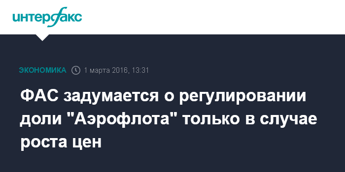 Москва. 1 марта. INTERFAX.RU – Доля "Аэрофлота" на российском рынке авиаперевозок, которая превысила 50% после ухода "Трансаэро", сама по себе не является предметом для беспокойства, ФАС будет прибегать к регулированию только в случае завышения цен, сказал глава ведомства Игорь Артемьев.
