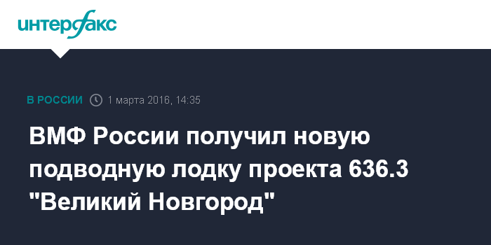 Москва. 1 марта. INTERFAX.RU - Торжественный спуск на воду новейшей дизель-электрической подводной лодки проекта 636.3 "Великий Новгород" состоится 18 марта, в Санкт-Петербурге на ОАО "Адмиралтейские верфи".