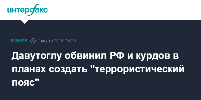 Москва. 1 марта. INTERFAX.RU - Турецкий премьер-министр Ахмет Давутоглу обвинил Россию в намерении вместе с курдами создать у южных границ Турции некий "террористический пояс".