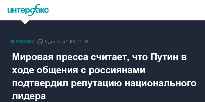 Москва. 5 декабря. INTERFAX.RU - Зарубежная печать в пятницу уделила большое внимание телевыступлению премьер-министра РФ Владимира Путина, который, отвечая 4 декабря на вопросы россиян в прямом телерадиоэфире, по мнению западных журналистов, вновь подтвердил репутацию национального лидера.