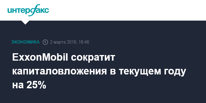 Москва. 2 марта. INTERFAX.RU – Крупнейшая нефтяная компания США Exxon Mobil в среду объявила о сокращении запланированных на 2016 года капиталовложений на 25%, до $23 млрд.