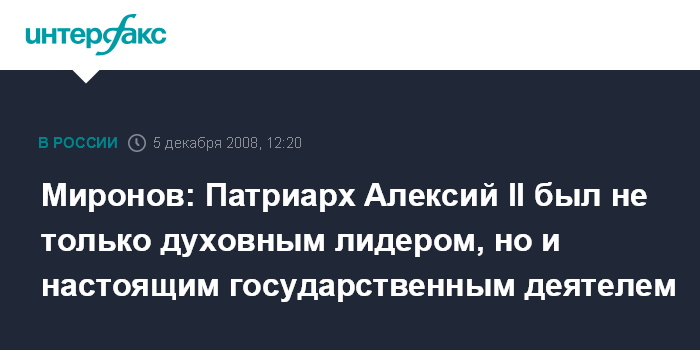 "Это невосполнимая потеря для всех православных русских людей, где бы они ни проживали", - сказал журналистам Миронов. При этом он подчеркнул, что всегда, "когда встречался с Алексием, то говорил с патриархом не только как с духовным наставником, но и как с настоящим государственным деятелем, которого волновали все проблемы - будь то экономические, социальные или внешнеполитические". Спикер выразил соболезнование всем православным в связи со смертью Патриарха. "И еще невозможно осознать, что патриарха больше нет", - сказал он.