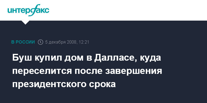 Москва. 5 декабря. INTERFAX.RU - Президент США Джордж Буш купил дом в одном из богатых кварталов города Далласа, куда он планирует переселиться после 20 января 2009 года, когда его место в Белом доме займет Барак Обама.