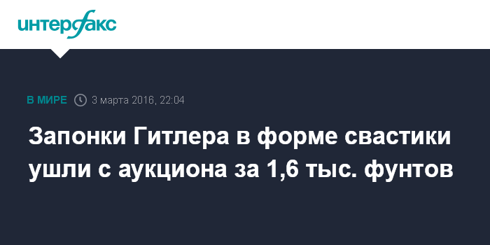 В городе Ладлоу графства Шропшир, недалеко от границы Англии и Уэльса, состоялся аукцион по продаже нацистской символики. За 1,6 тыс. фунтов была продана пара запонок, принадлежавшая Адольфу Гитлеру. Как отмечается, лидеру нацистской Германии их подарил идеолог фашизма, глава Италии Бенито Муссолини. Запонки декорированы фасциями, символизировавшими в фашисткой Италии партию Муссолини.